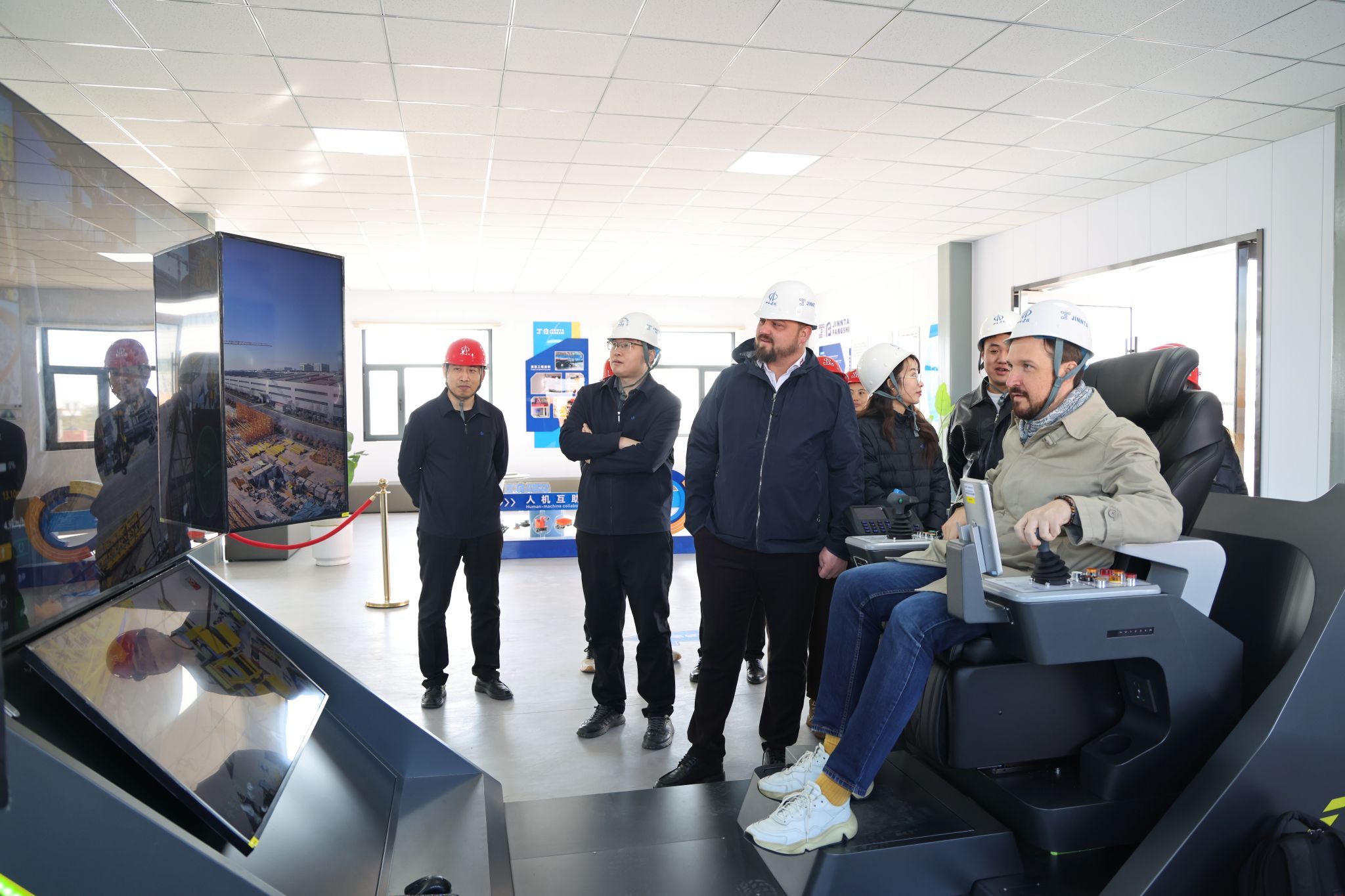 在智能化联合厂房,俄罗斯UM公司客商参观了塔式起重机片式标准节智能化生产线和智能化涂装生产线,了解了专业化、绿色化生产流程。在东广场,观摩了建筑机器人系列产品,体验了动臂塔机和塔式起重机远程遥控驾驶系统。