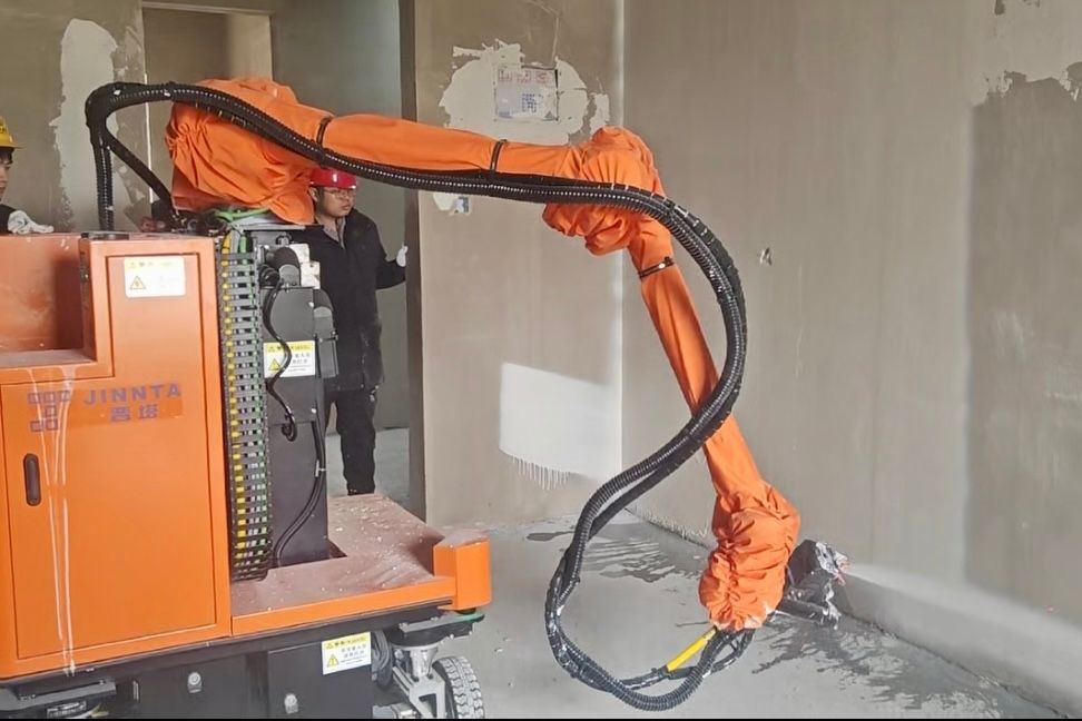 在山西师范大学南校区建设项目,晋塔智能机器人表现优异。喷刮打磨一体机器人凭借视觉导航技术精准定位作业区域,机械臂灵活运转,墙角、阴阳角等复杂部位一次成型,施工作业几乎不产生粉尘,让施工环境更绿色环保。该设备30分钟即可完成100m²的作业量,施工效率是人工辊涂、打磨的5倍以上,姿态误差±1°,定位精度±5 cm。在人机施工效果对比宿舍展区,机器人作业墙面与传统施工作业墙面对比鲜明,其作业均匀度远超人工操作,现场观摩人员直观感受到“机械化换人、自动化减人”的显著优势。