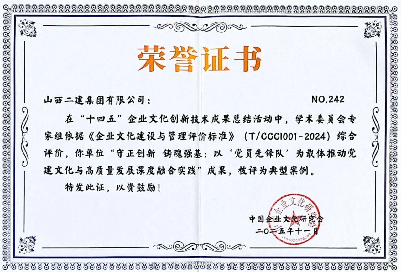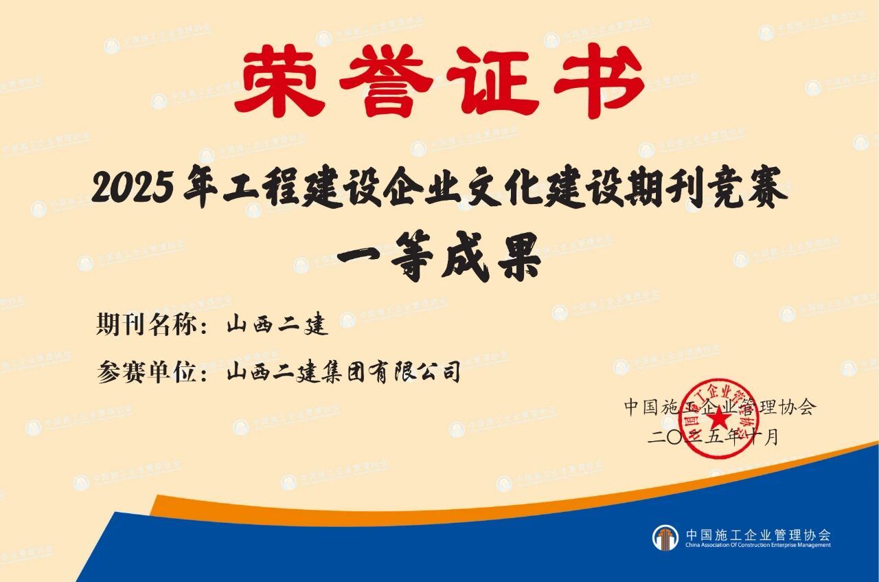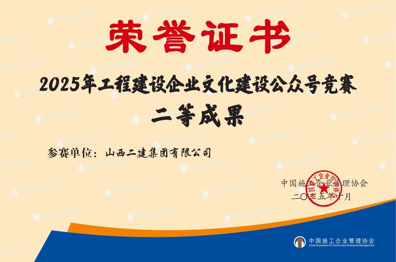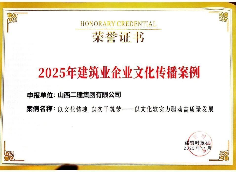 在中国企业文化研究会主办的2025年中外企业文化峰会上,二建集团申报的《守正创新铸魂强基:以“党员先锋队”为载体推动党建文化与高质量发展深度融合实践》成果获评典型案例;在2025年建筑业企业文化成果发布会暨建筑时报社全国通联工作会议上,宣传期刊《山西二建》获评“2025年建筑业优秀出版刊物”;《以文化铸魂以实干筑梦——以文化软实力驱动高质量发展》入选2025年度企业文化传播案例;河北黄骅市海园里项目《红色引擎·匠心筑家》获评2025年度建筑业项目党建品牌案例;在中国施工企业管理协会2025年工程建设企业文化成果评选中,《山西二建》期刊、二建集团微信公众号分别荣获一等成果和二等成果。