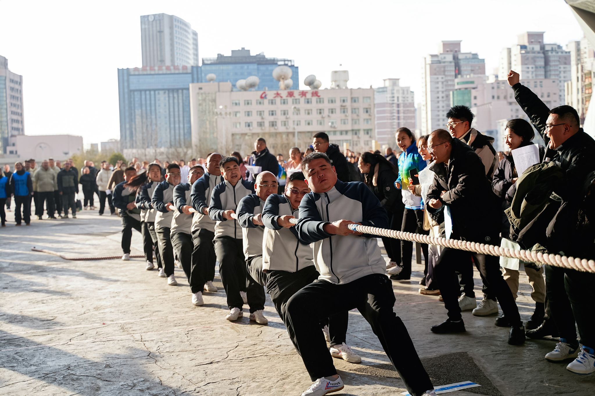 拔河比赛,参赛队员紧握长绳,重心下压,齐声呐喊。中线的标志绳在双方僵持中来回移动,考验着团队的爆发力与持久力,每一次胜利都是团队同心协力、坚持到底的成果,将“人心齐,泰山移”的精神体现得最为透彻。
