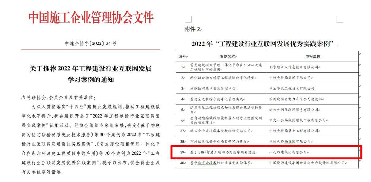 同时,该案例还获评中施企协2022年“工程建设行业互联网发展优秀实践案例”,被中施企协推荐为学习案例。