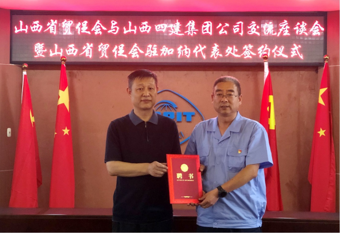 7月30日,公司与山西省贸促会举行交流座谈会暨驻加纳代表处签约仪式,山西省贸促会副会长李秀生、公司海外事业部总经理杨军伟出席。