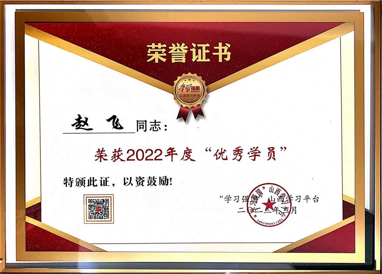 在2022年度“学习强国”山西学习之星、强国志愿之星、优秀工作者、模范组织评选活动中,集团职工赵飞荣获山西学习平台优秀学员称号。