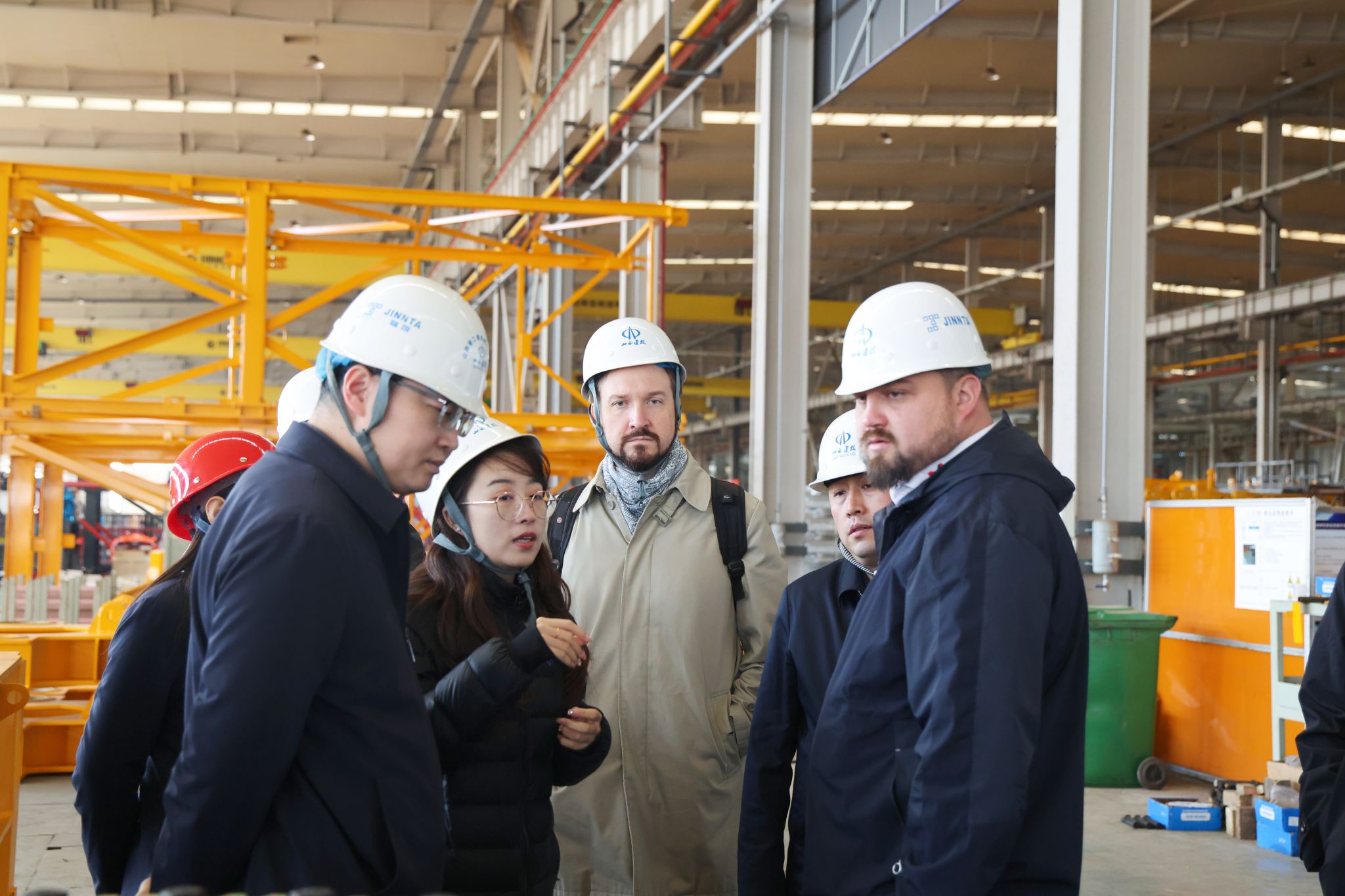 在智能化联合厂房,俄罗斯UM公司客商参观了塔式起重机片式标准节智能化生产线和智能化涂装生产线,了解了专业化、绿色化生产流程。在东广场,观摩了建筑机器人系列产品,体验了动臂塔机和塔式起重机远程遥控驾驶系统。